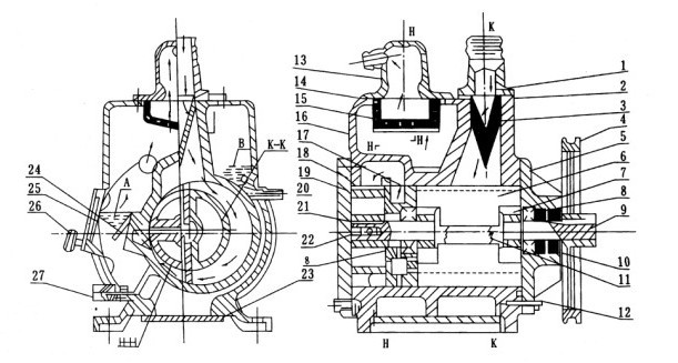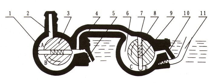 圖(1)是2X型旋片式真空泵的工作原理圖,轉子3及7與高真空室外1及低真空室6相切,轉子3及7沿箭頭方向旋轉,帶動轉子槽內滑動的轉片旋轉,由于彈簧9及離心力的作用, 轉片外端緊貼高低真空室的內表面滑動,把轉子與高低真空室所形成的月洼形空間從進氣嘴2到排氣閥門5和從過氣管4到排氣閥門10之間分隔開來,形成二或三個容積,并且周期性的大小變化,當在圖示旋片式真空泵位置繼續旋轉時A及C容積逐漸增大,被抽容積氣體沒進氣嘴進入泵內,同時B及D容積逐漸減少,壓力升高,隨后沖開排氣閥門5及10,將氣體排出真空室外,氣體經過油面而排于大氣之中,因為油是淹住排氣門的,故能防止氣體返回真空室。當抽氣壓強較高時,高低真空室的閥門都排氣,相當于單級泵,當真空度較高時,全部氣體進入真空室,再由排氣閥門10排出,此時二級串聯即進入雙級泵工作。