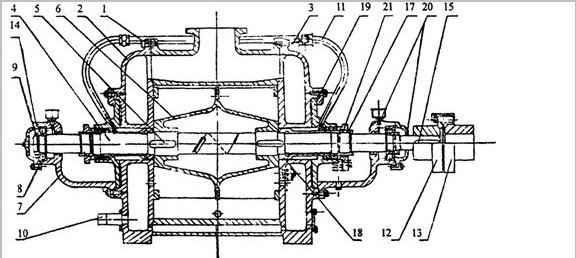 裝配時最主要的是調(diào)整葉輪端面和側(cè)蓋的間隙,在兩邊總的間隙對開SZ-3及SZ-4不得超過0.4毫米,對SZ-1及Z-2不得超過0.3毫米。間隙由泵體(1)和側(cè)蓋(2)之間加墊取得,葉輪兩端間隙應(yīng)該均稀,可擰軸套螺母(17)以移動葉輪來保證.